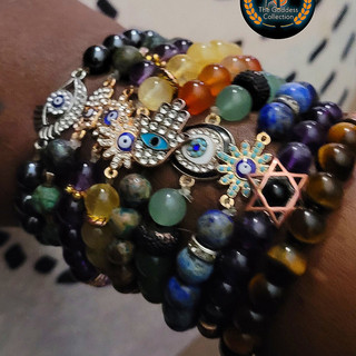 Bracelets wearing today: Evil Eye Hematite 8mm Bracelet, Hamsa African Turquoise 8mm Bracelet, Evil Eye Amethyst 8mm Bracelet, Evil Eye Citrine 8mm Bracelet, Hamsa African Turquoise, 8mm Bracelet, Evil Eye. Jade 8mm Bracelet, Evil Eye, Tiger Eye, Lapis Lazuli 8mm Bracelet Merkaba Amethyst 8mm Bracelet, Buddha Tiger Eye 8mm Bracelet